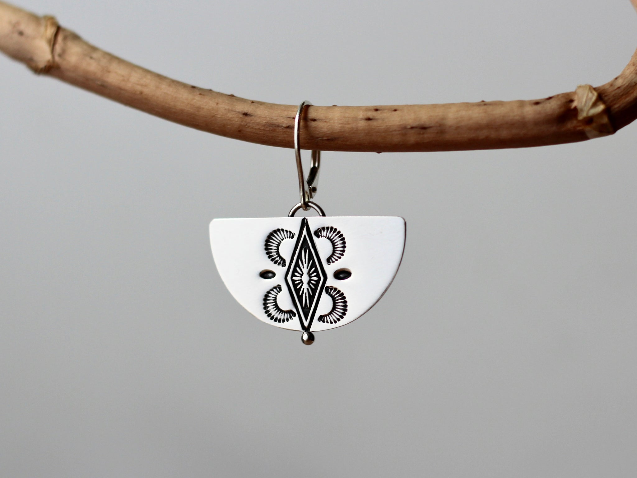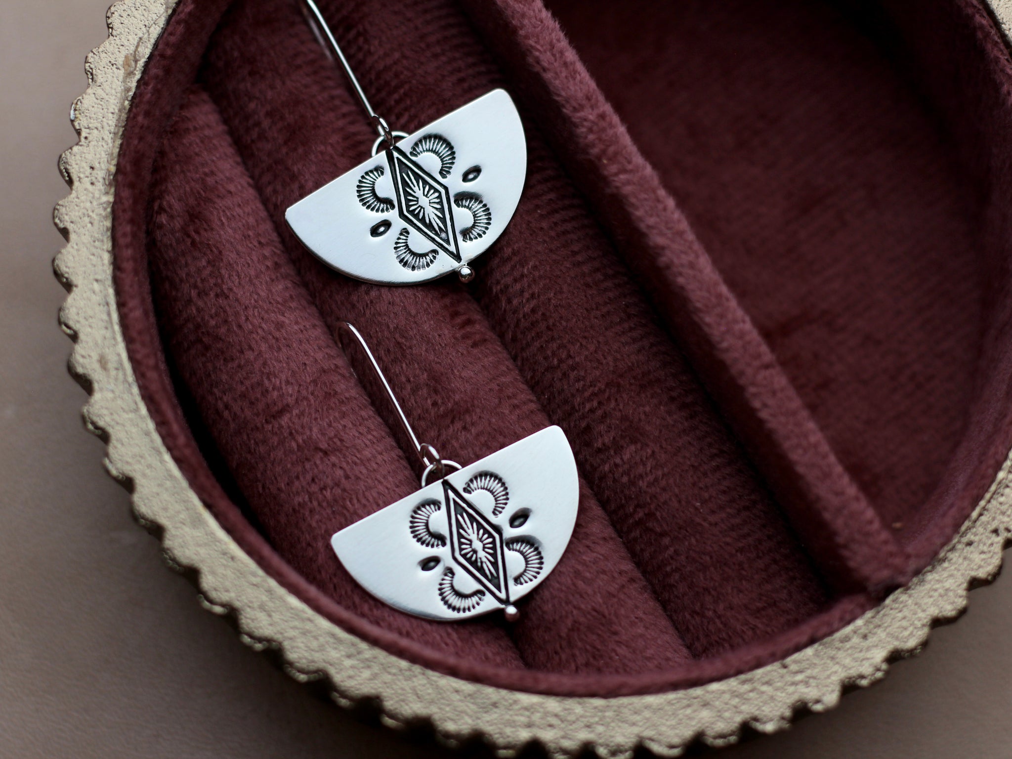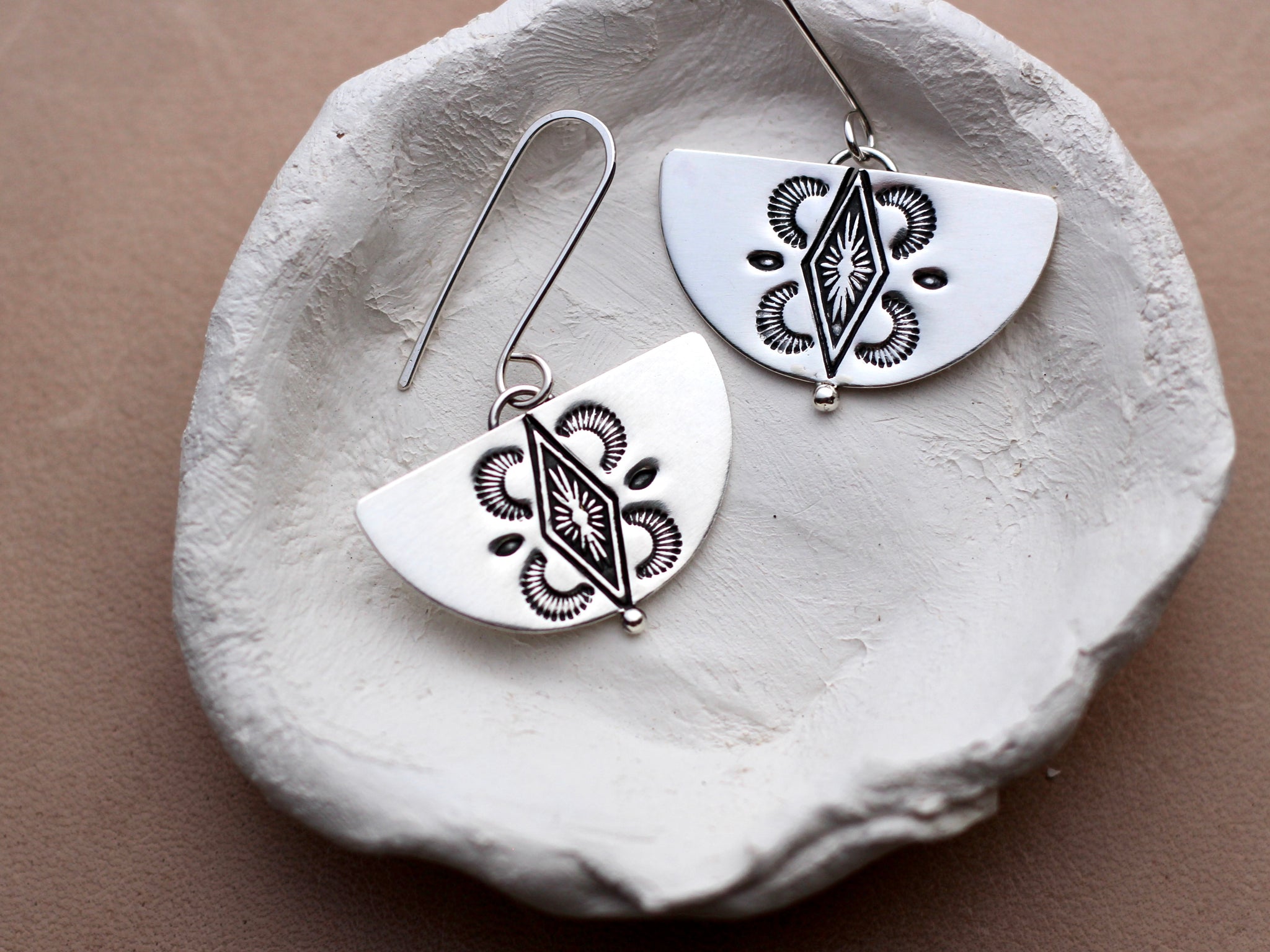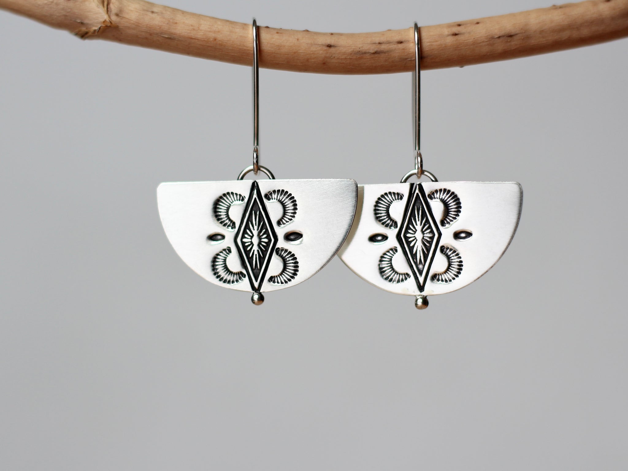 Handmade, unique silver earrings. Stamped details that lend to a bohemian style.